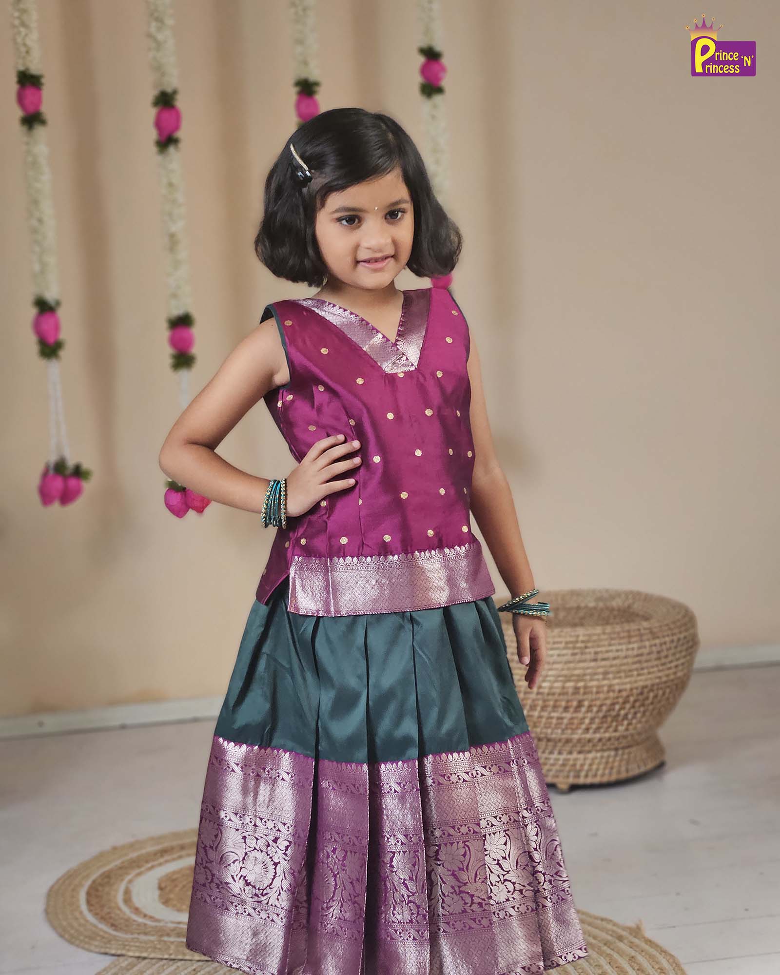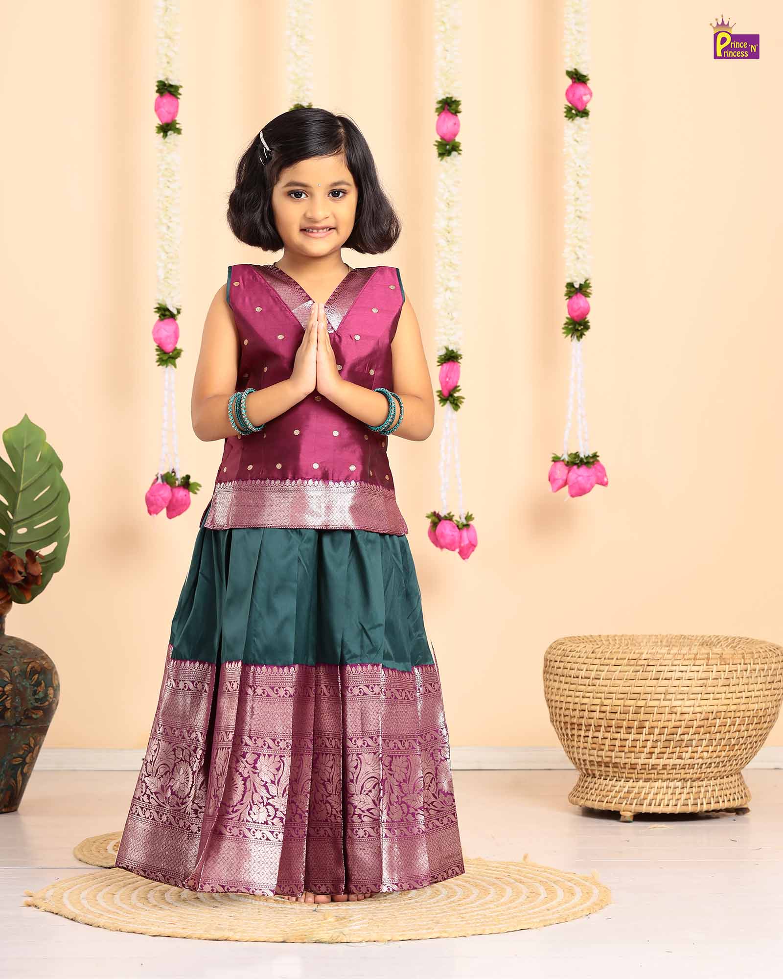 Pattu Pavadai Wine Green Raw Silk Banarasi Border | Kids Festival Wear PPP1628