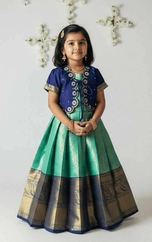 Kids Traditional Aari Work Pattupavadai in Green PPP2022