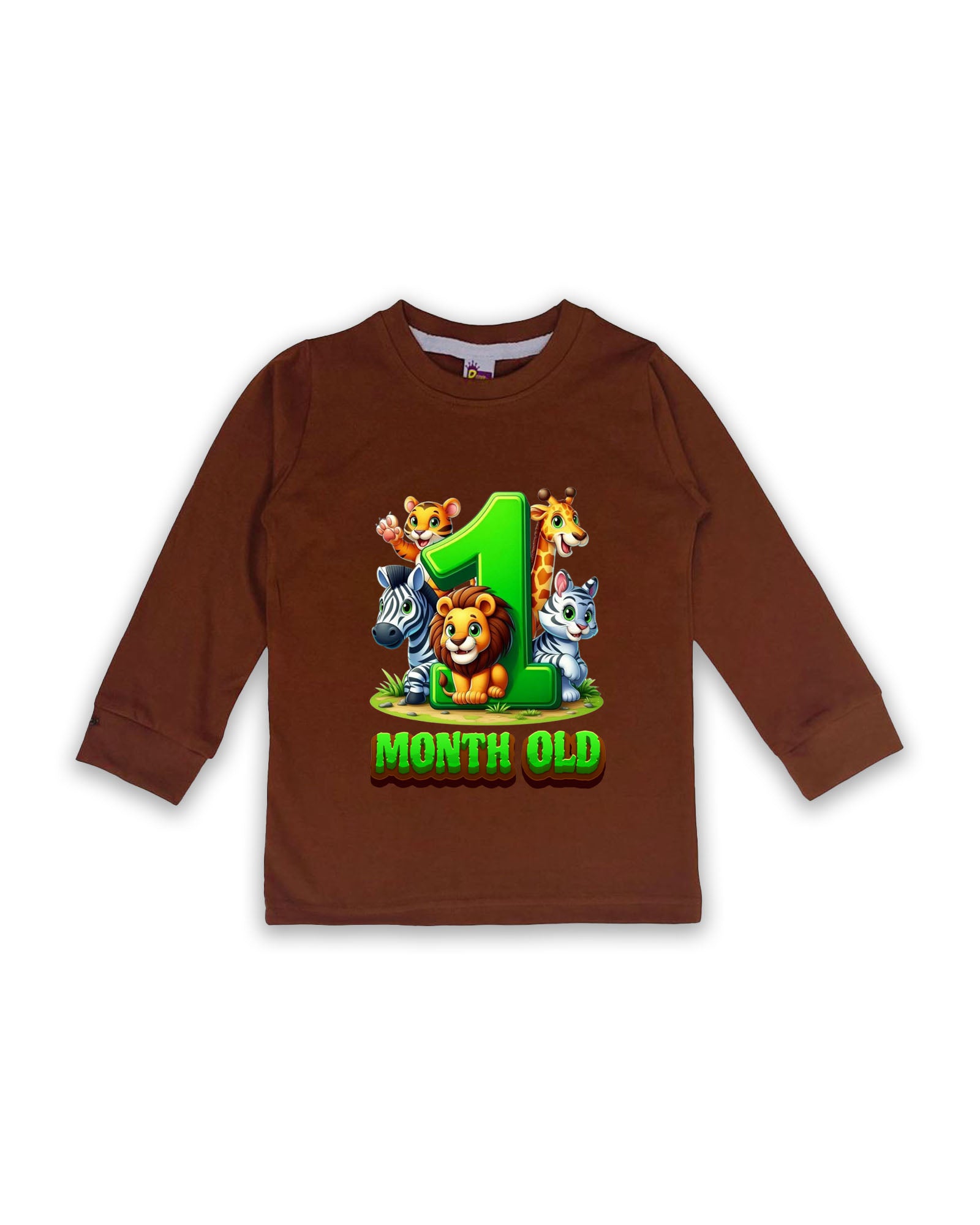 Celebrate your baby's first milestone in style with this adorable “1 Month Old” Chocolate Brown full sleeve tees. Crafted from soft and breathable cotton, this tees features vibrant jungle animals and a big green “1” – making it perfect for monthly milestone photos, baby showers, or gifting. The cheerful lion, zebra, giraffe, and cub design brings a fun, playful touch to your baby's wardrobe.