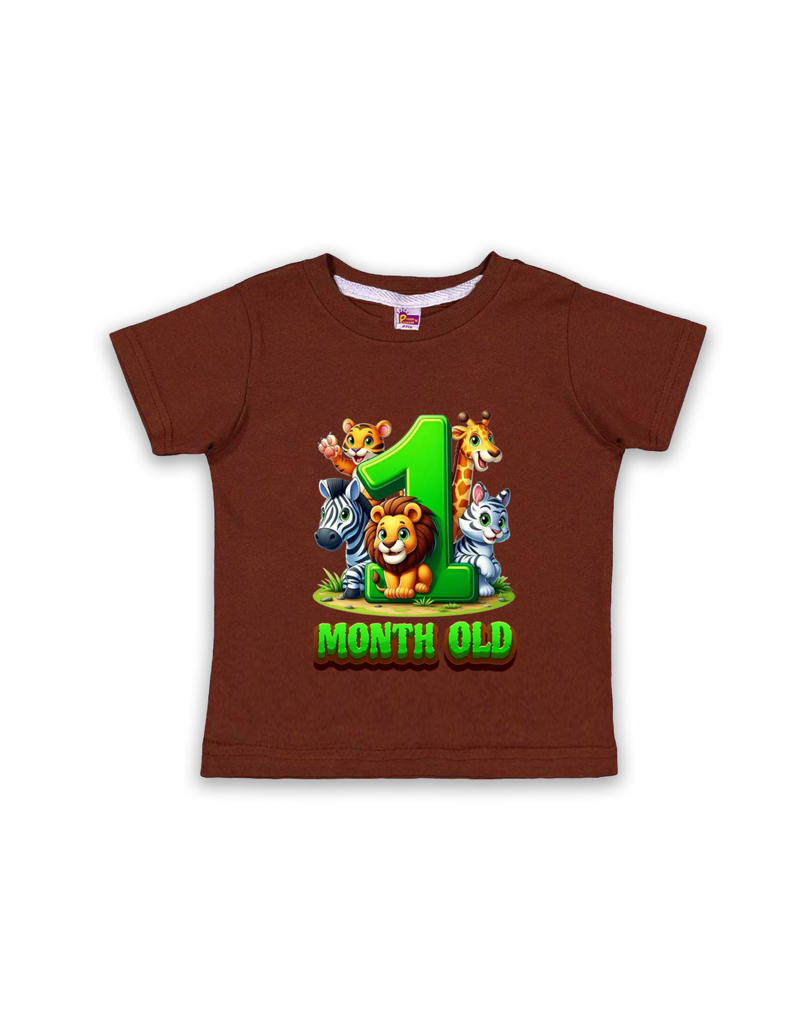 Celebrate your little one’s first milestone in style with this vibrant chocolate brown “1 Month Old” baby tees. Featuring adorable jungle animals like a lion, zebra, giraffe, and tiger cub around a big green number “1,” this tees is perfect for milestone photos, celebrations, or a fun baby gift. Made from soft, breathable cotton, it offers all-day comfort for your baby’s delicate skin.