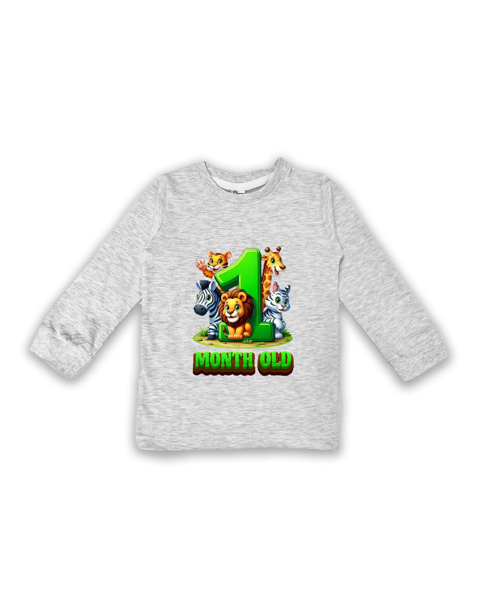 Celebrate your baby's first milestone in style with this adorable “1 Month Old” Melange full sleeve tees. Crafted from soft and breathable cotton, this tees features vibrant jungle animals and a big green “1” – making it perfect for monthly milestone photos, baby showers, or gifting. The cheerful lion, zebra, giraffe, and cub design brings a fun, playful touch to your baby's wardrobe.