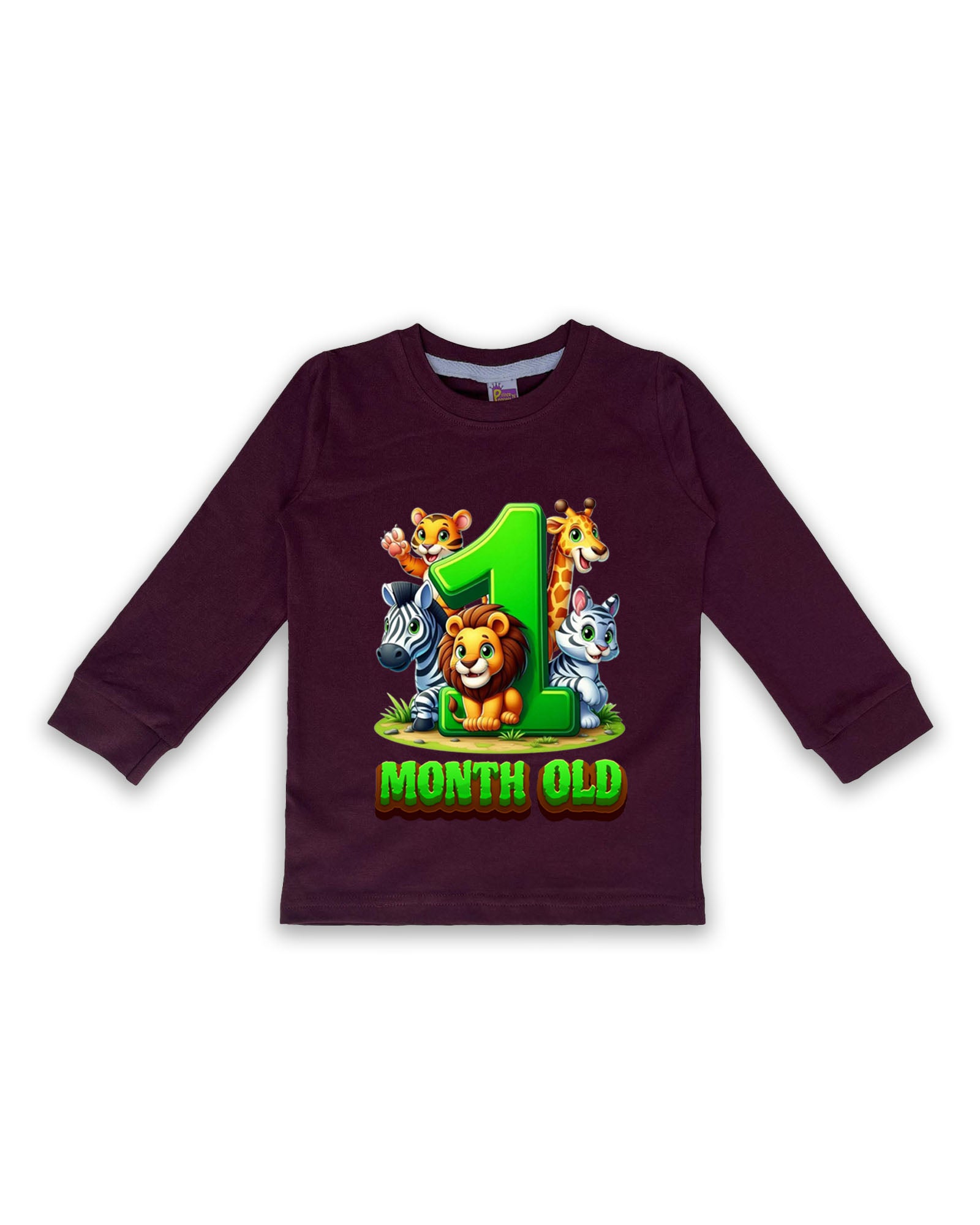 Celebrate your baby's first milestone in style with this adorable “1 Month Old” wine full sleeve tees. Crafted from soft and breathable cotton, this tees features vibrant jungle animals and a big green “1” – making it perfect for monthly milestone photos, baby showers, or gifting. The cheerful lion, zebra, giraffe, and cub design brings a fun, playful touch to your baby's wardrobe.