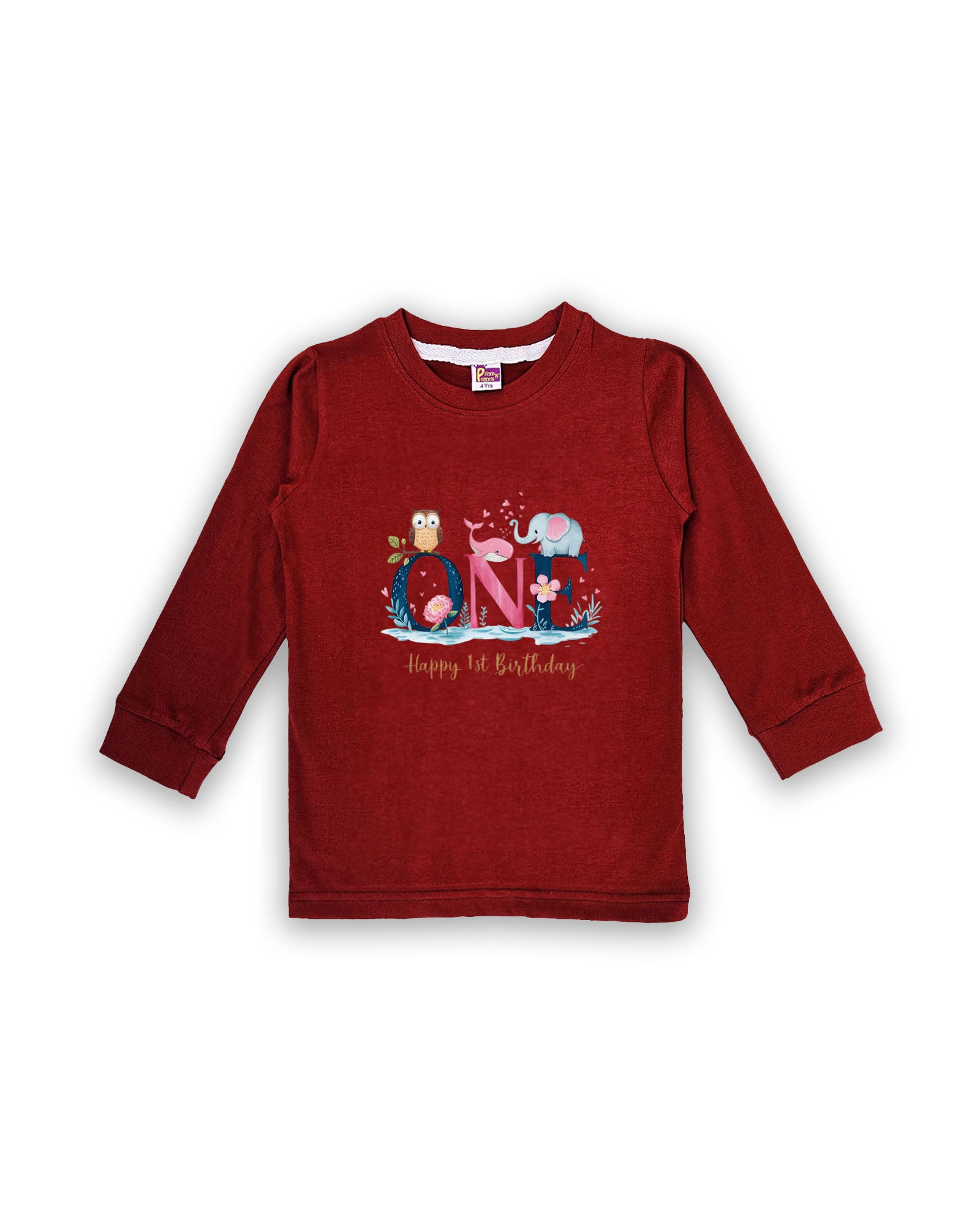 Celebrate your baby girl's first birthday in style with this adorable Maroon full-sleeve tees featuring the word "ONE" decorated with cute animals like an owl, elephant, and whale, along with lovely floral details. The soft cotton fabric ensures all-day comfort while the charming design makes it perfect for birthday parties, cake smashes, and milestone photoshoots.